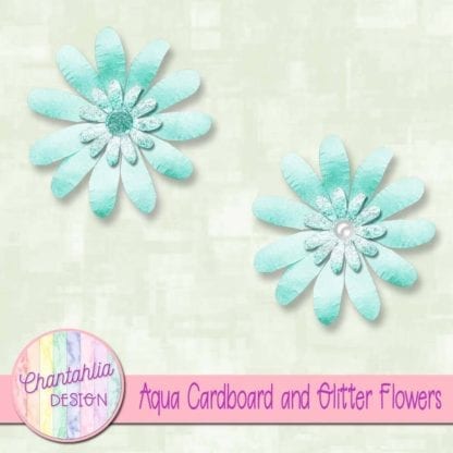 This file contains 2 cardboard and glitter flowers in aqua. The aqua cardboard and glitter flowers are transparent png files.